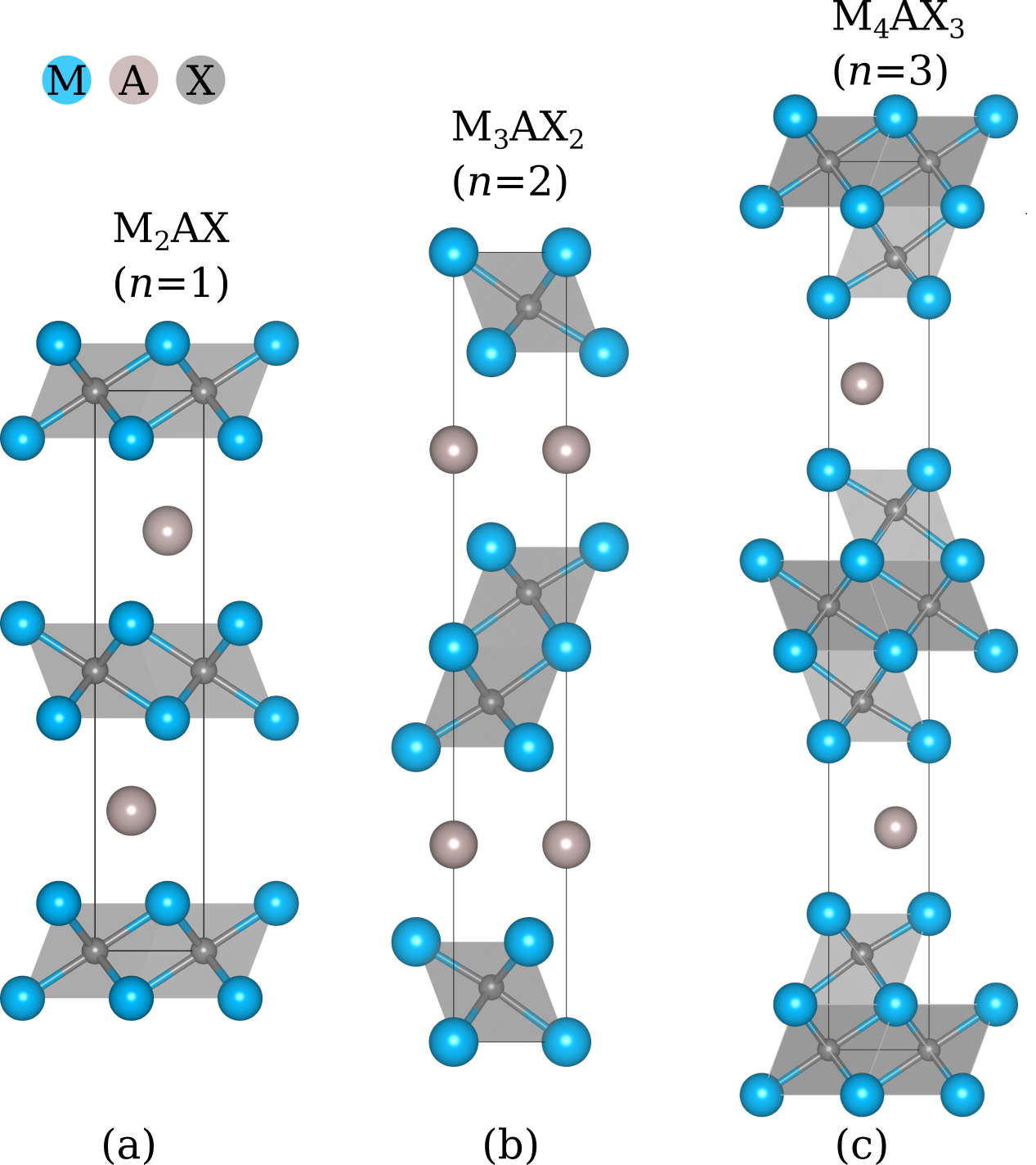 Figure 1: Crystal structures of three types of MAX phases: (a) M2AX, (b) M3AX2 and (c) M4AX3, which differ in the number of MX layers defined by the n value. Each MX layer consists of edge-sharing X-centered M6X octahedra.