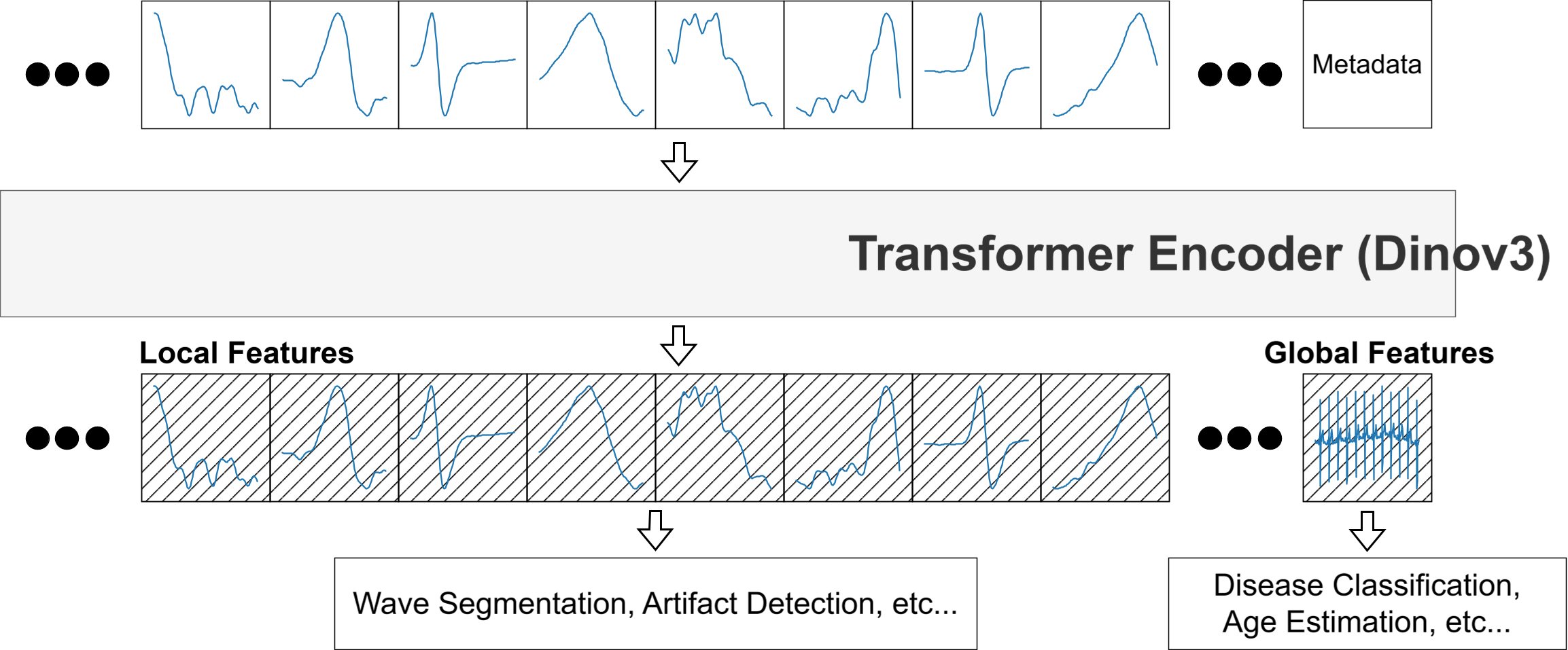 Figure 1: Overview of the ECG foundation model based on dinov3. The model processes the ECG in patches and outputs local features for each patch and global features for the complete ECG.