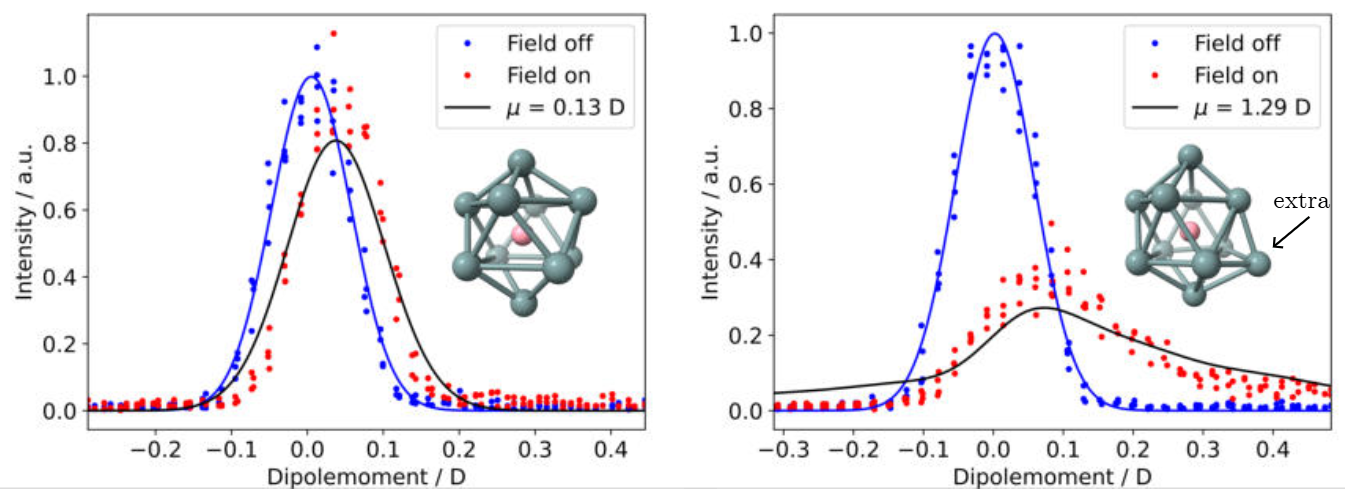 Figure 1: Experimental electric beam profiles of CoSn10 (left) and CoSn11 (right) at 16K nozzle temperature and 24kV deflection voltage. The quantum chemical structures are found by global optimization and the electric beam profile is simulated by using the dipole moment and the moments of inertia of the structure to solve the Euler equations in an electric field (black line). The structure motive of CoSn10 is also present in CoSn11 in which the extra tin atom just sits at the side of the Sn10 cage, leading to a great increase in the dipole moment of the cluster.