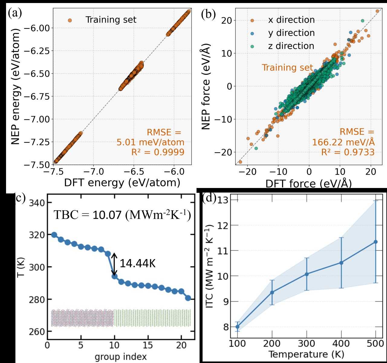Figure 2: Comparison between DFT and NEP potentials for the interface: (a) energy and (b) forces. (c) Temperature profile of the interface. (d) Interfacial thermal conductance as a function of temperature.