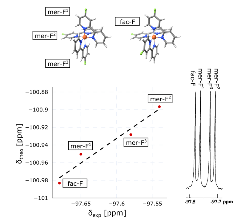 Correlation between theoretical and experimental 19F chemical shifts for the single signal of the facial and the three signals of the meridional isomers of [Fe(bpy-4-F)3]Cl2.