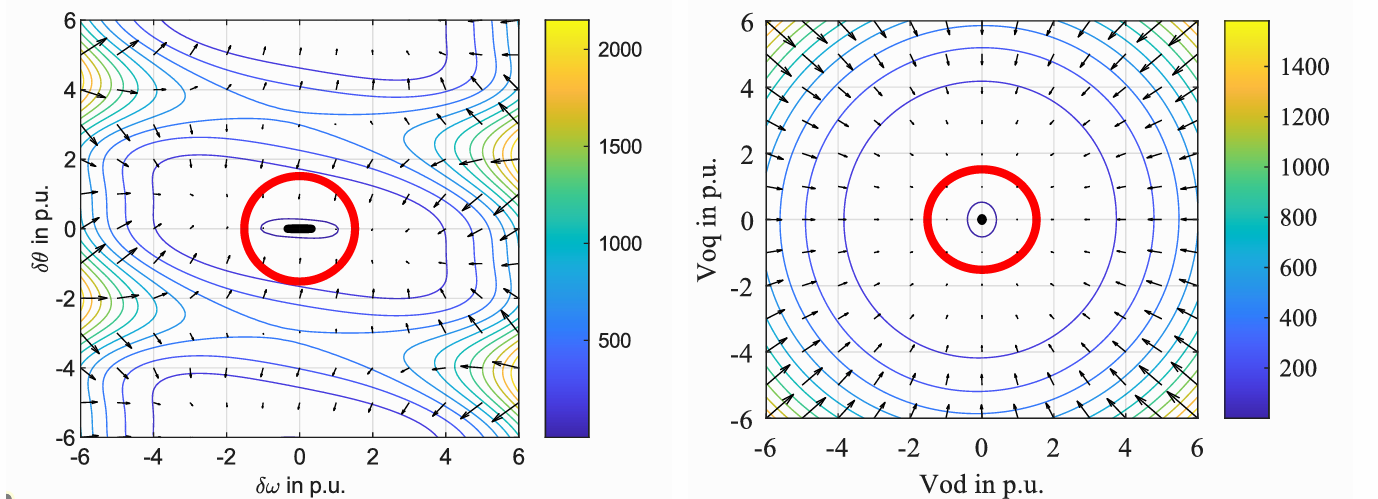 Figure 1: Contour of Lyapunov function(colour), the domain D (red), the ROA (black) and the gradients (arrows)