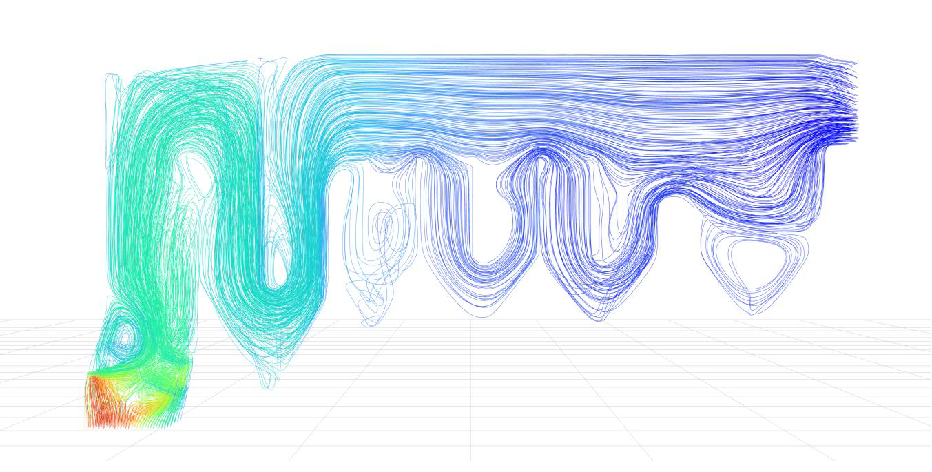 Figure 1: Particle path and velocity distribution(red: high velocity, blue: low velocity) of the exhaust gas.